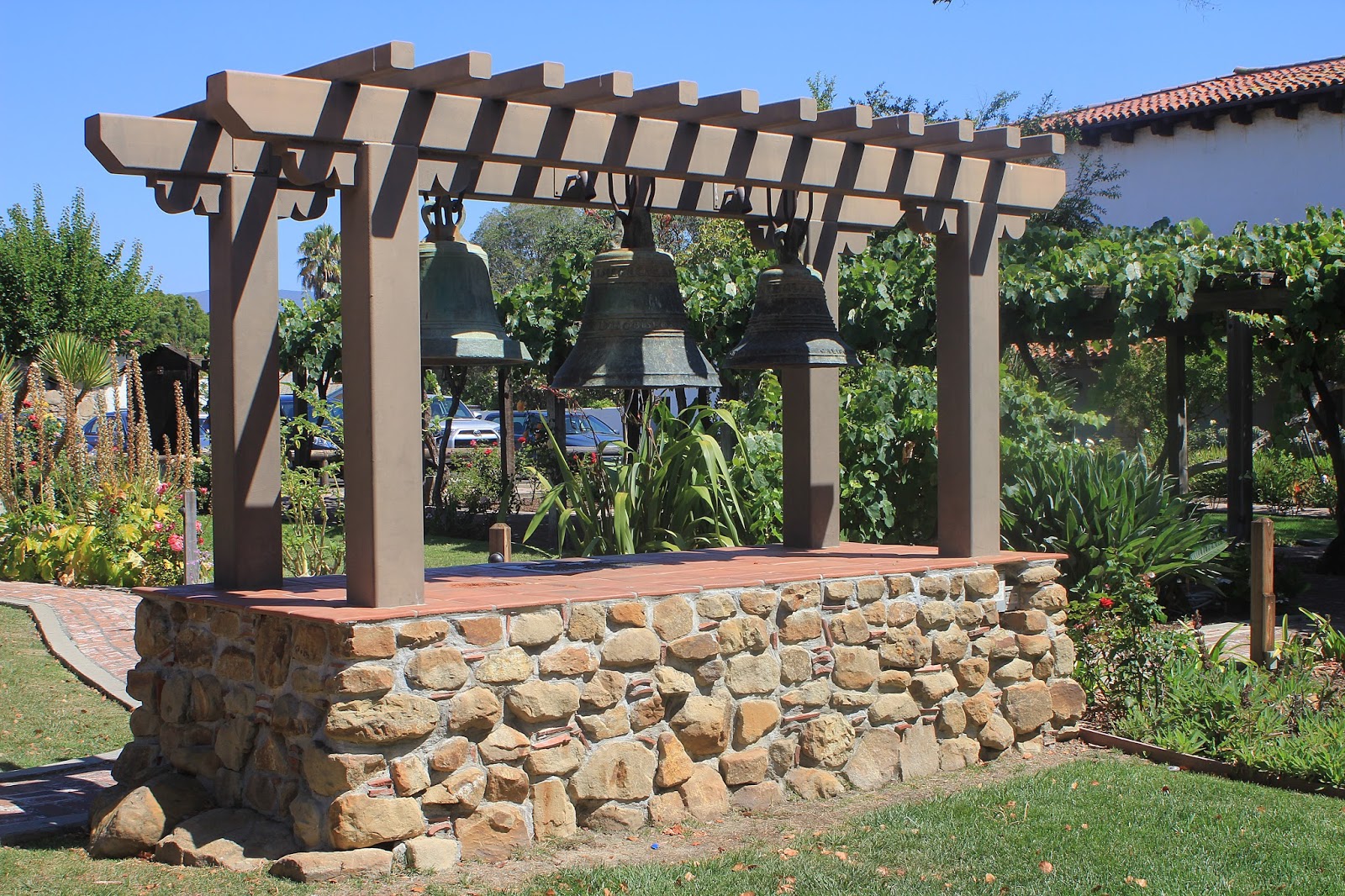 Entrance to the Mission church. The five mission bells from left to right are: Carlos, Diego, Antonio, Gabriel and Luis. They were put into service in 2005 and named in honor of the first five missions