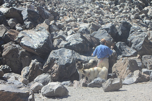 After leaving Hartley Springs campground and rejoining Glass Flow Road, we drove about a quarter mile past the parking area for Obsidian Dome before turning back, as the road became narrower and more difficult to navigate beyond that juncture. There was only one other vehicle at the Obsidian Dome parking lot and that was great. We tried to chat with the husband-wife couple hiking around the dome, but Addy and Sasha were especially vociferous during our attempted conversation. I guess they were in their protective and/or flippy I just wanna bark mood...Obsidian Dome is a mile-long, 300 ft. high volcanic glass lava dome that's part of the Inyo Volcanic chain. The beautiful, albeit sharp, piles of obsidian rocks are a sight to behold and totally worth the offroad trip. On our way back to Convict Lake, we detoured off on Mammoth Lakes Scenic Loop through the town of Mammoth Lakes. Highlights along the drive were Showy Penstemon (Penstemon speciosus) and Leichtlin's Mariposa Lilies (Calochortus leichtlinii).