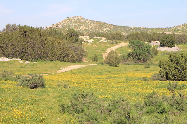 Harford Springs Reserve is a 325 acre Riverside County Park that sits on a plateau at around 2,000' elevation in the Gavilan Hills area 2 miles south of Cajalco Road. Oaks, California Junipers, a nice variety of spring wildflowers and the absence of throngs of visitors makes this place a true hidden gem. One of the takeaways from this trip (other than the inherent beauty of this locale) is the fact that you can't always trust WAZE. Yes, Waze - that GPS-based navigation app that so many of us love to use when stuck in traffic. I'd say it's about 90% accurate most of the time, but in this case we ended up on the south part of the reserve at an entry point that was gated because it happened to be private property. So Waze took us from I-15N to Cajalco Road east, then south on Lake Mathews Drive, north on Gavilan Road, north on Idaleona Road, and finally north on Piedras Road where we dead ended at the gate. Undeterred or perhaps clueless at this point, we continued up Piedras Road and turned left at the next intersection on Panamint Road where we parked across a farmstead. The lady of the manor was very friendly, surrounded by her large pack of barking and jumping doggies and enthusiastic children, and said that we could hike into the preserve from across the way, and so we did. The trails here are dog, horse, bicycle, and ATV friendly, but we didn't encounter any of the above on this trek. I wasn't able to find an official website for this RivCo park, but here's one from a hiker who has traversed these parts: http://californiathroughmylens.com/harford-springs-reserve. On our return back to Cajalco Road, we discovered that the "official" entry to the park was only a short distance south of Cajalco Road off Gavilan Road, so duly trip-noted.